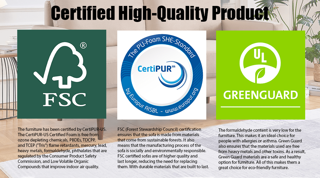 Sofas certified by FSC: FSC(Forest Stewardship Council) certification ensures that the sofa is made from materials that come from sustainable forests. With durable materials that are built to last.