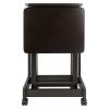 Make entertaining simple and easy with the Winsome Wood Brienda 5-Piece Snack Table Set. A perfect companion piece for a casual meal in front of the TV or on the patio. Four folding snack tables great for daily use and compact enough to store in the closet. An upright stand is an innovative addition to this set as it serves as a rack to store the folded tables discretely when not in use underneath the double-drop leaf top that provides extra table top space when needed. Keep glasses; ice; appetizers; and serving dishes on the expanding table top while using the individual folding snack trays for dining. Transport from one room to another as the stand doubles as a serving cart. The cart has four plastic casters for easy mobility; 2 of which lock to keep the unit firmly in place. Wheel it onto the patio for picnics or into the family room for the big game so guests can help themselves to chips and dip. When not in use; flip up the tabletop to store the snack tables easily and securely in individual slots built into the stand. All the tables have smooth; rounded edges and are made of solid wood in a deep coffee finish that will easily mesh with most decor and can last over time with repeated use. Conveniently packed and shipped in 1 box; that includes the hardware necessary for assembling the stand. Tables arrive ready to use and require no assembly. Replacement part request can be submitted directly to the manufacturer within 60 days from date of purchase.