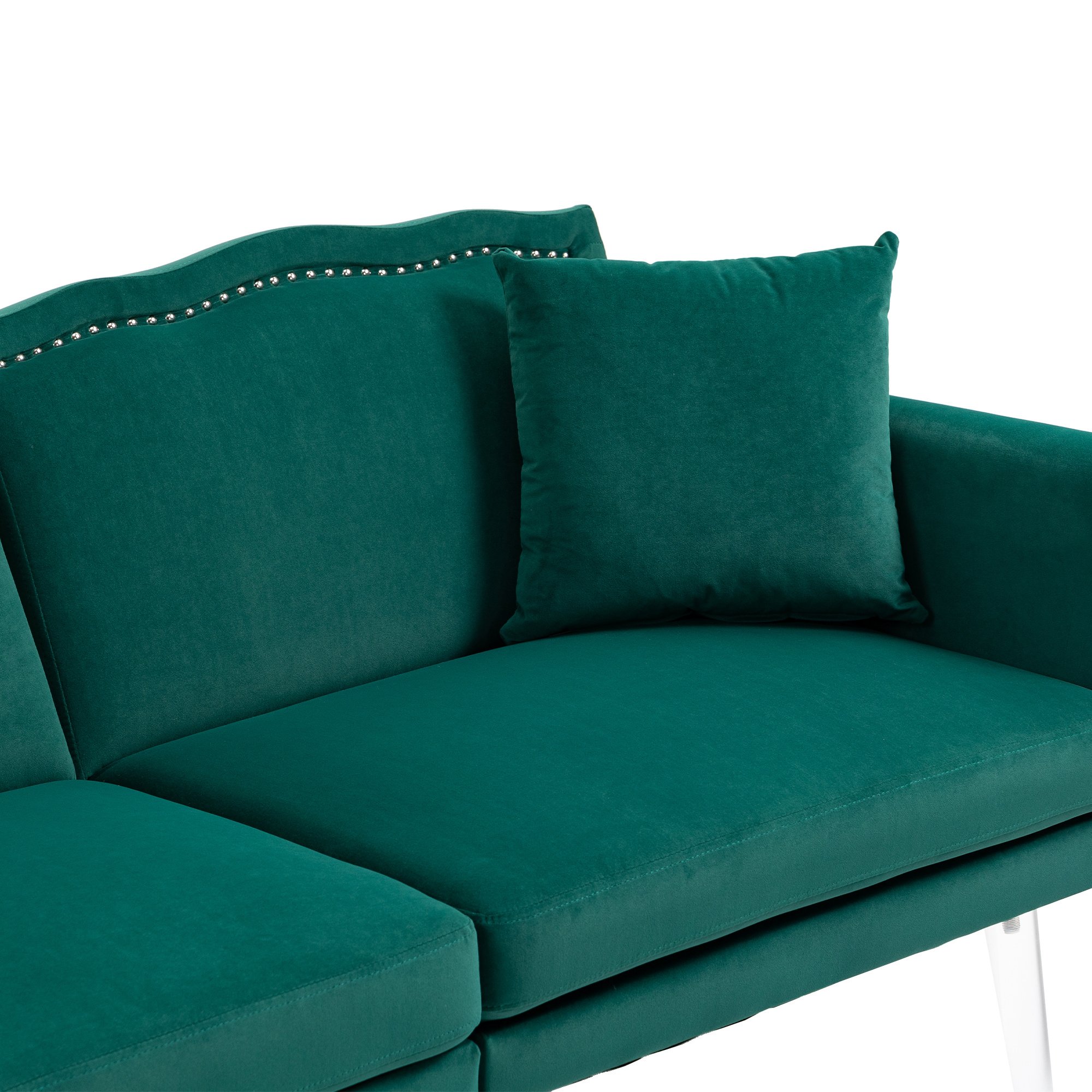 Products size30.31'' H x64.57'' W x 31.50'' DBack Height - Seat to Top of Back15.75''Leg Height8.66''Arm Height23.62"Seat Width56.19''Seat Depth19.69''Seat Height16.54''Net weight77.14LBGross Weight85.96LBFeet materialACRYLICUpholstery MaterialVelvetProduct TypeSofaFrame MaterialPlywoodSeat Fill MaterialFoamWeight Capacity500LBAssembly Required:YES